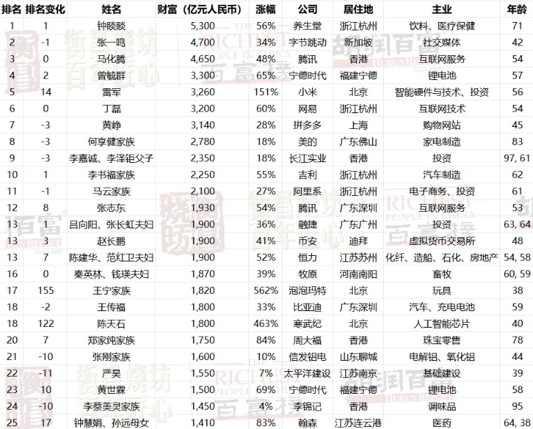 榜单显示,71岁的农夫山泉(09633.HK)创始人钟睒睒财富同比激增1900亿元,以5300亿元第四次成为中国首富,并刷新了中国首富的财富纪录。钟睒睒的财富主要来源于农夫山泉,该公司稳居中国包装饮用水市场首位,上半年营收超过250亿元,市值年内涨幅超60%。