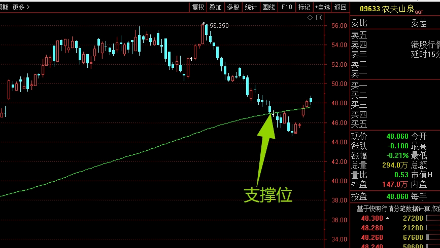 $农夫山泉(HK|09633)$ 中期趋势没问题,一直都是震荡上行的趋势,前期高位震荡回落,跌破了大均线的支撑,这几天反弹又能拉升回来站上,但还没有远离,所以接下来主要是看大均线47.582位置附近的得失,能稳住问题就不大,继续震荡看反抽动作,但站不稳就都要谨慎应对,防着随时的破位回落杀跌风险。#炒股日记# #收盘点评#