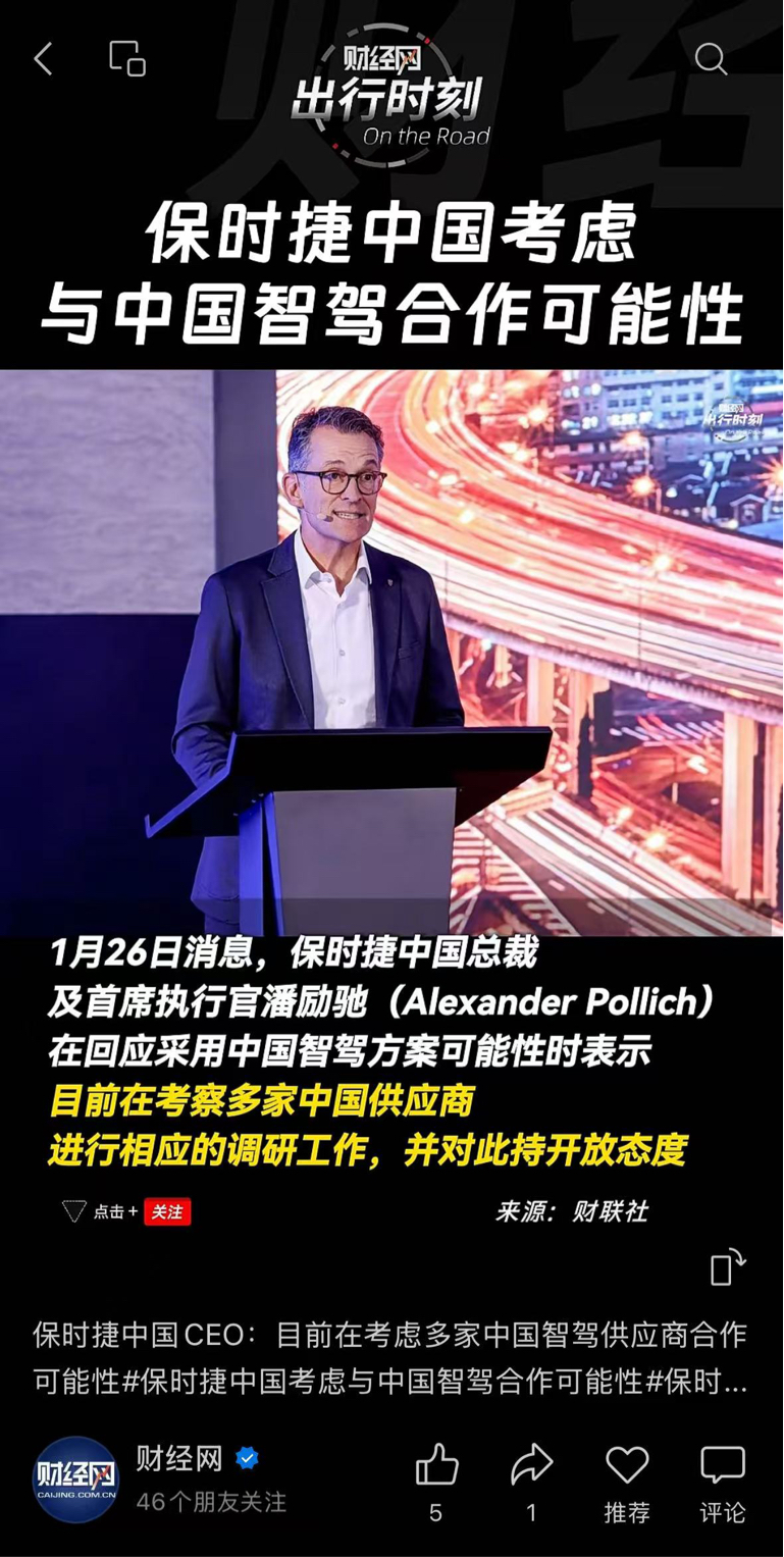 最近保时捷中国总裁及首席执行官潘励驰接受采访,在回应采用中国智驾方案可能性时表示,目前在考察多家中国供应商。