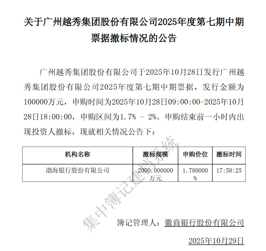 据公开信息,该票据为“25越秀集团MTN007”,规模10亿元,期限2年,票面按面值100元发行,起息日与缴款日均为10月29日,每年10月29日按固定利率付息,2027年10月29日到期兑付,将于10月30日在全国银行间债券市场上市流通。