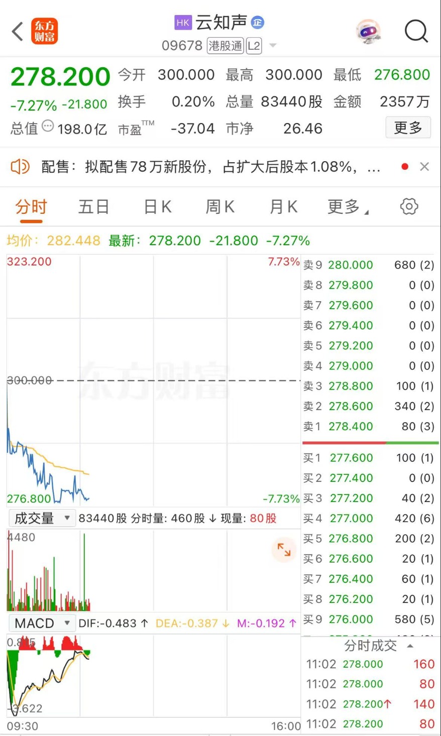 港股异动|拟折价配售78万股新H股 云知声跌近8%
