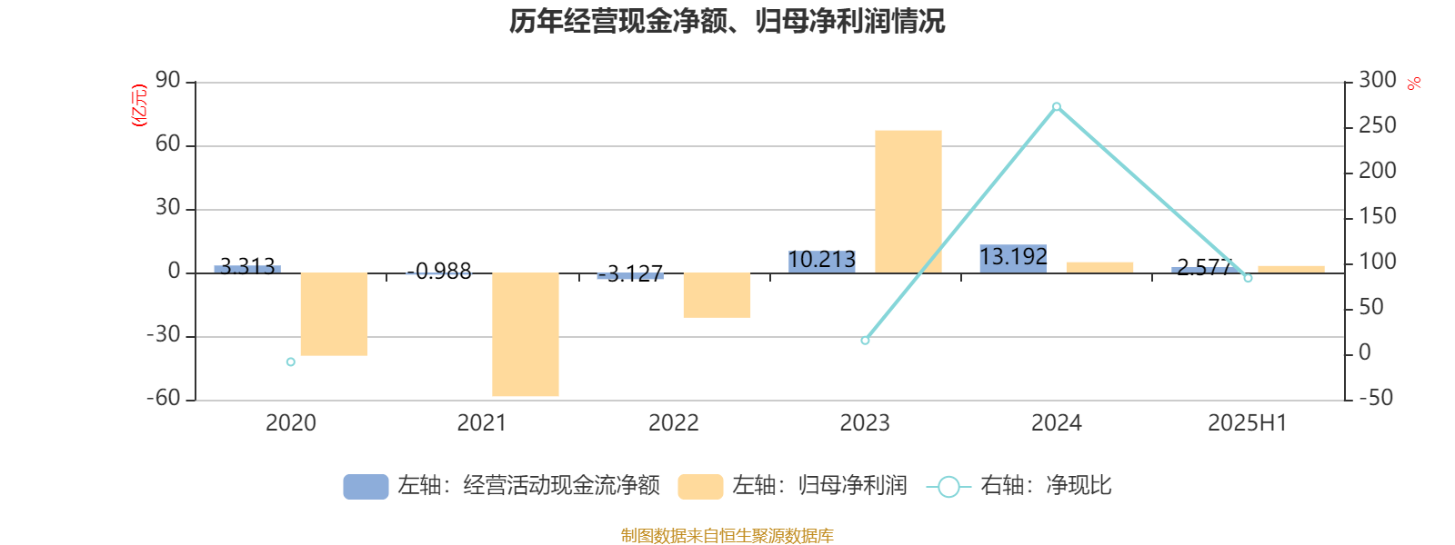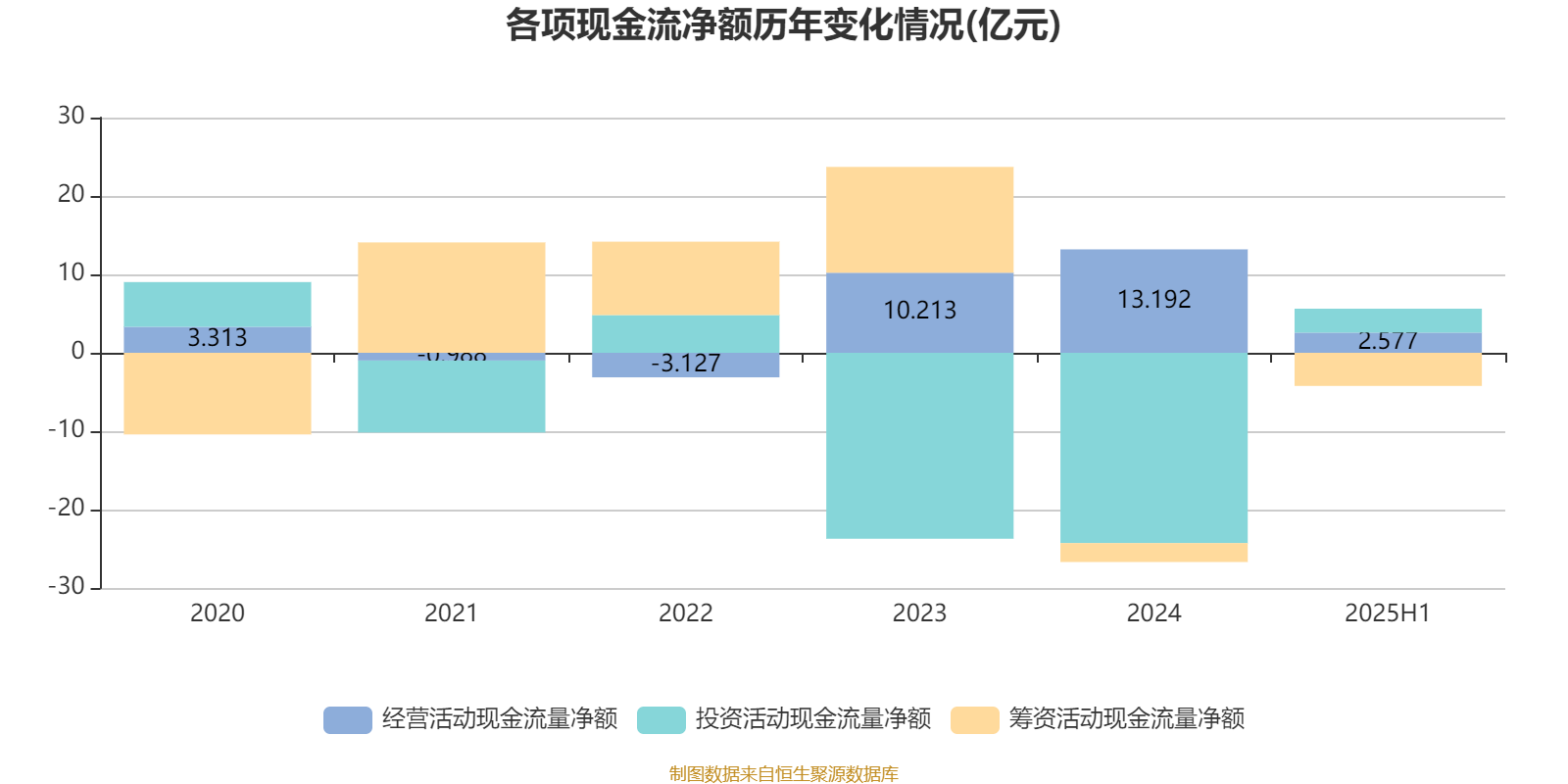 2025年上半年,公司经营活动现金流净额为2.58亿元;筹资活动现金流净额-4.22亿元;投资活动现金流净额3.05亿元。