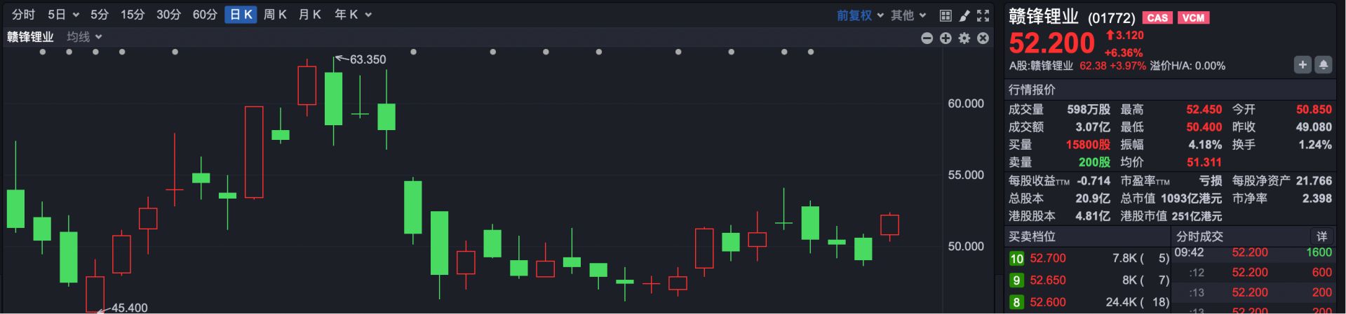 焦点公司方面,天齐锂业(HK09696)和赣锋锂业(HK01772)两家锂矿公司早盘均涨超6%。