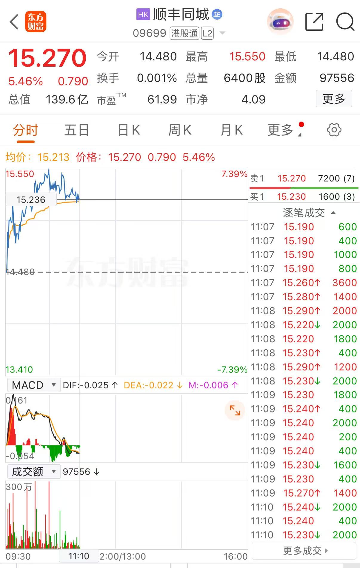上证报中国证券网讯2月6日早盘,顺丰同城一度涨超7%,最高报15.55港元/股。截至11时10分,顺丰同城报15.27港元/股,涨5.46%。