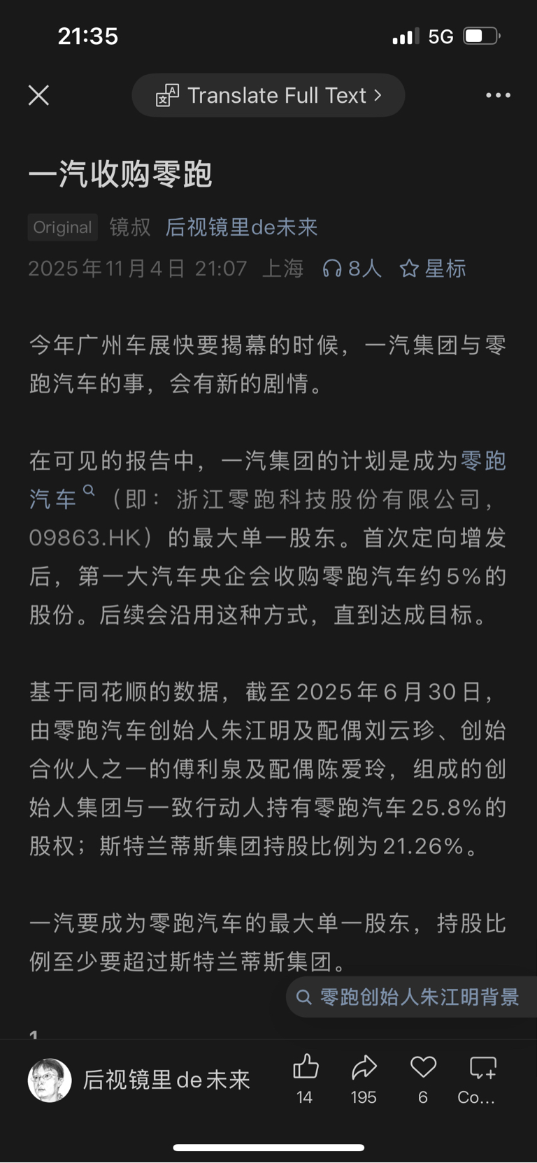 $零跑汽车(HK|09863)$ 一汽要收购零跑股份?