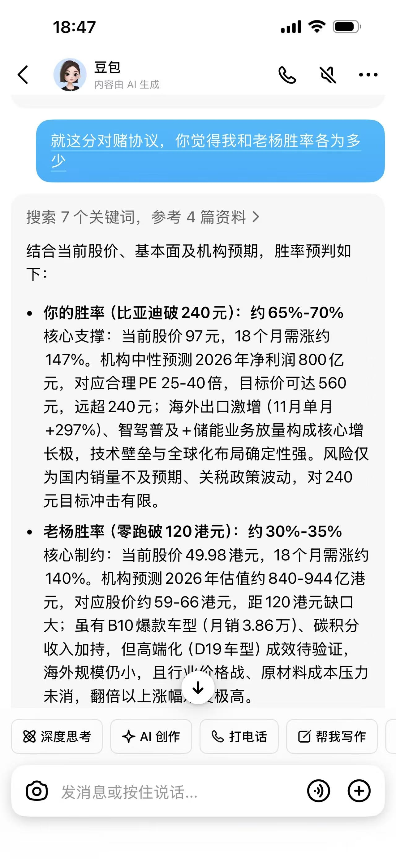 $零跑汽车(HK|09863)$ 昨日与某股神签了一份对赌协议,鄙人老杨声明即日起定投零跑。保证言行一致,坚决做多。鄙人老杨将无惧豆包预测之较低胜率,坚定不移看多零跑!各位股友请自便,此声明仅供参考,盈亏自负!