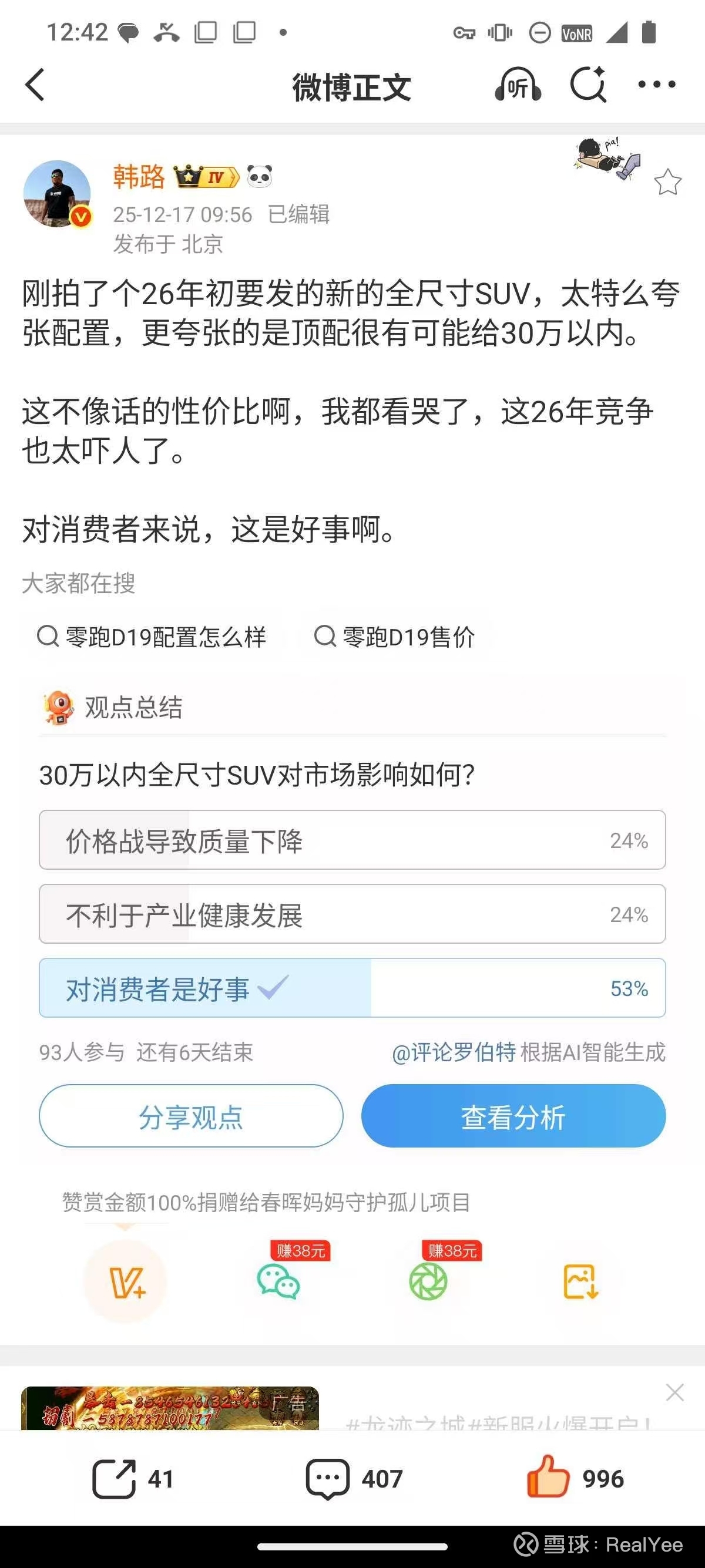 $零跑汽车(HK|09863)$ 近期微博上看到的消息,d19产品力真的拉满
