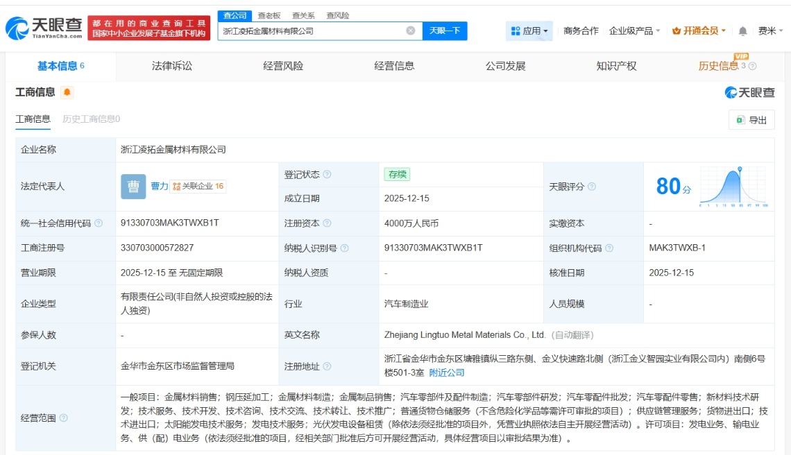 零跑汽车在浙江成立金属材料公司