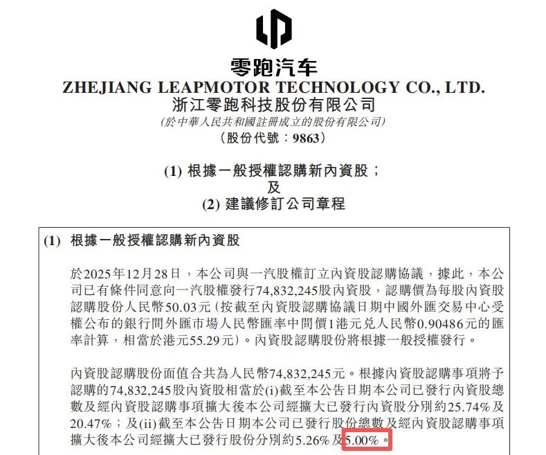 12月29日,零跑汽车发布公告称,公司拟向一汽股权投资(天津)有限公司(以下简称一汽股权)发行7483.22万股内资股。交易完成后,一汽股权将获得公司5%的股份。