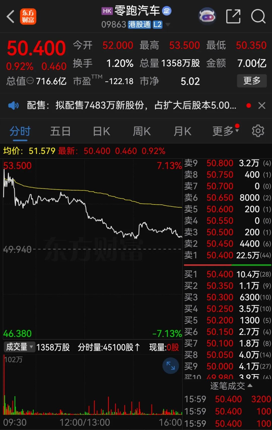 12月29日收盘,零跑汽车股价报50.40港元/股,总市值为716.6亿港元。