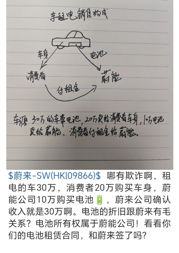 $蔚来-SW(HK|09866)$ 蔚来销售势头很猛!机构急眼了,想做多,筹码不够,发布老旧问题,打压吸筹!蔚来的做法没问题啊,哪里有财务造假!租电的车,车身卖给了消费者,电池同时卖给了蔚能,蔚来确认收入当然是车的总价,电池所有权是蔚能,折旧跟蔚来有个毛线关系?!这么优质的蔚能租赁公司,除去电池折旧后年化回报率9%以上,滚雪球式的租赁订单爆增,妥妥的包租公啊!