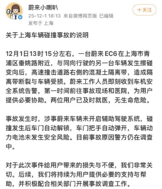 12月1日18时许,蔚来汽车官方辟谣微博号“蔚来小喇叭”发布事故说明:12月1日13时15分左右,一台蔚来EC6在上海市青浦区垂姚路附近,与同向行驶的另一台车辆发生擦碰变向后,高速撞击道路右侧的混凝土隔离带,造成隔离带断裂与车辆受损。蔚来工作人员即刻收到车机安全系统告警,第一时间前往事故现场和医院,为用户提供必要协助。两位用户已及时就医,无生命危险。