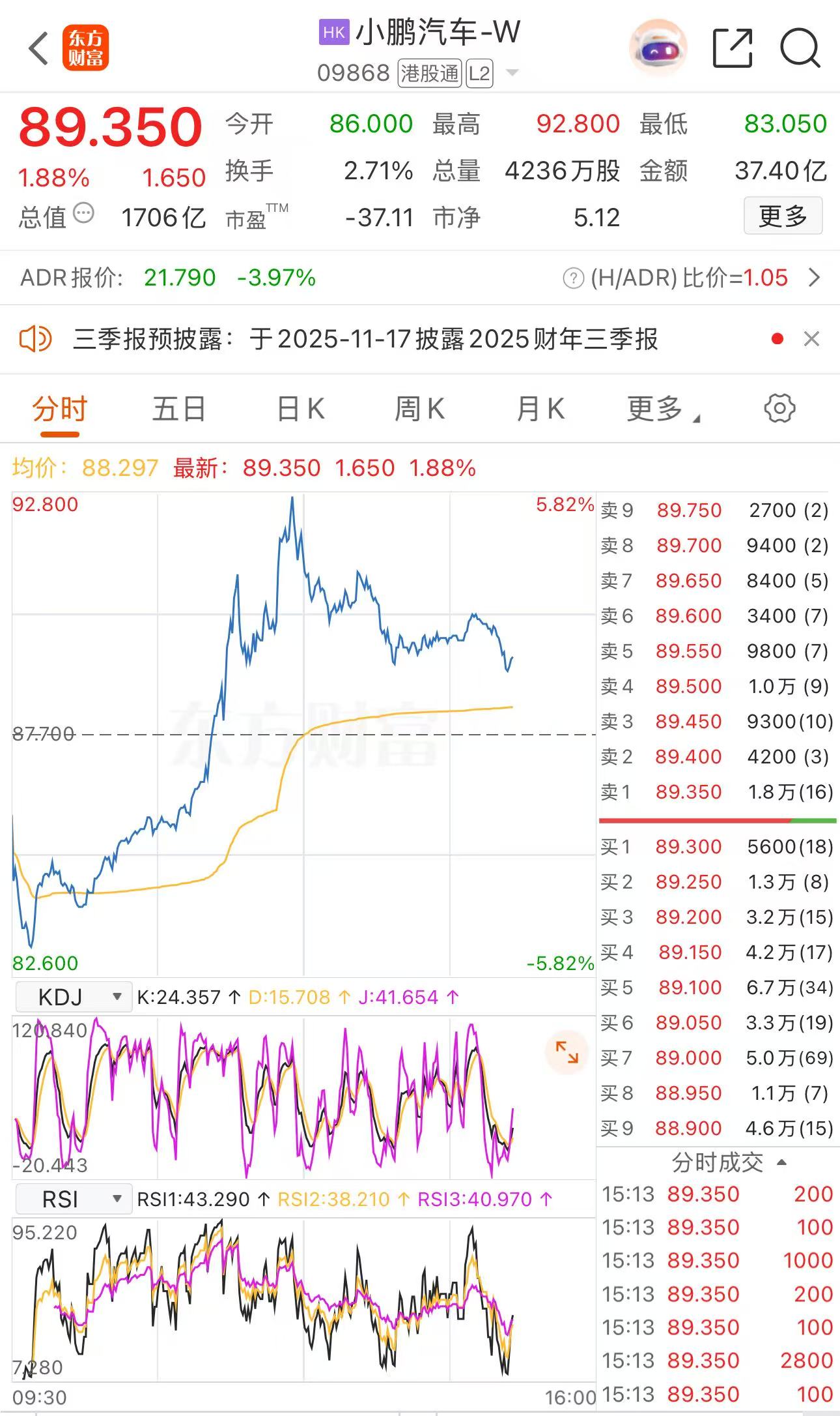 上证报中国证券网讯(记者唐燕飞)11月6日,小鹏汽车-W股价午后拉高,盘中一度涨近6%。今日早盘,小鹏汽车-W曾跌超5%,日内波动剧烈。截至15时13分,小鹏汽车-W涨1.88%,报89.35港元/股,成交额超过37亿港元。