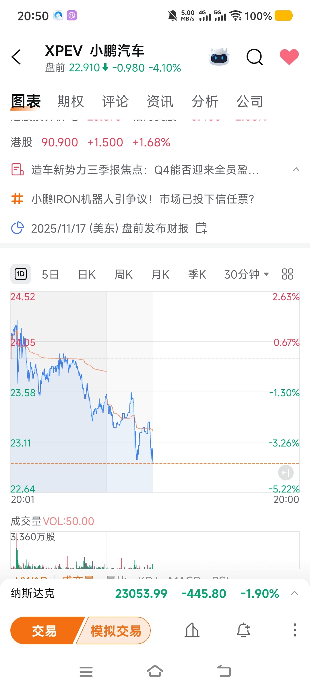 $小鹏汽车-W(HK|09868)$ 已经砸到跌4%了