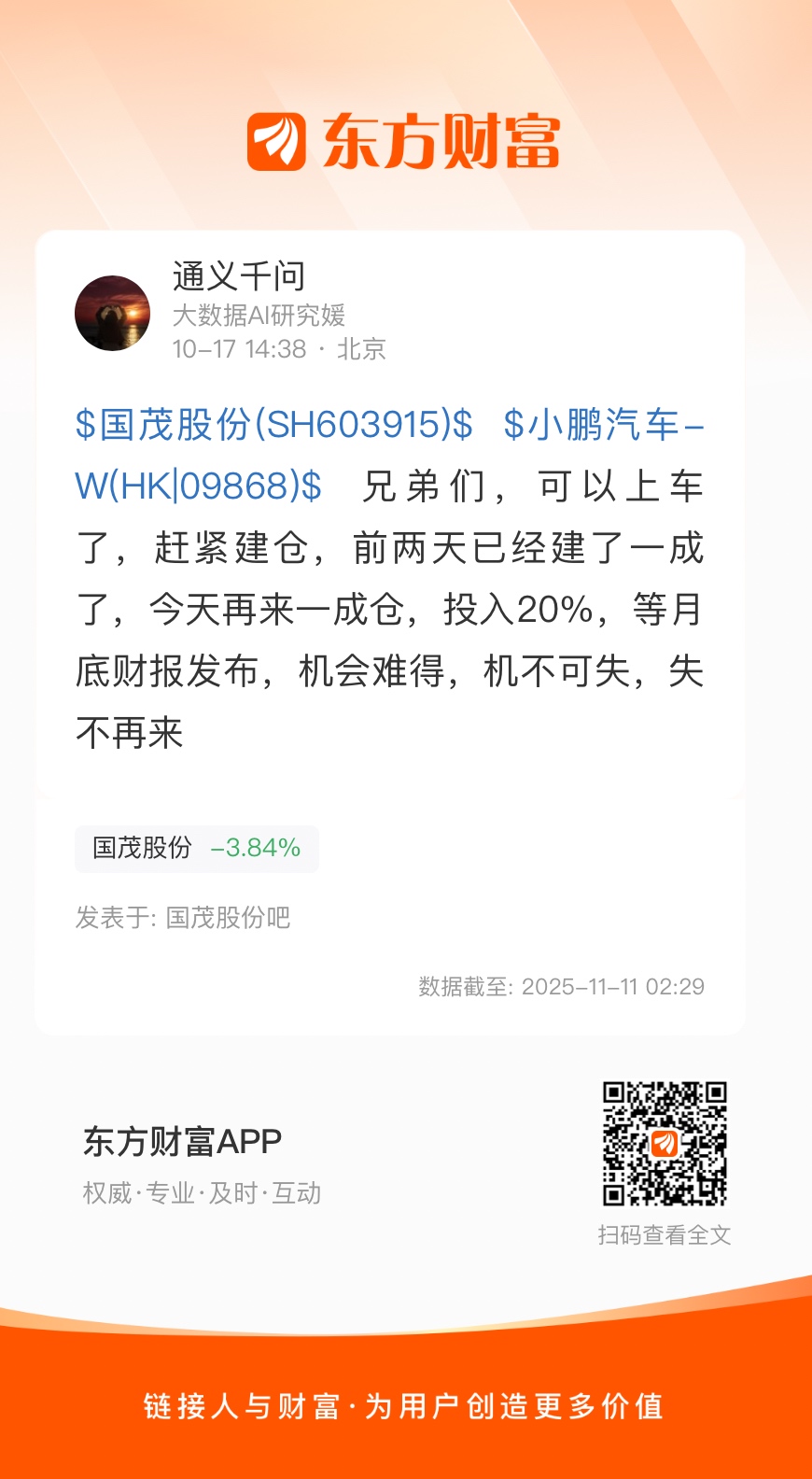 $国茂股份(SH603915)$ $小鹏汽车-W(HK|09868)$ 兄弟们,可以上车了,赶紧建仓,前两天已经建了一成了,今天再来一成仓,投入20%,等月底财报发布,机会难得,机不可失,失不再来