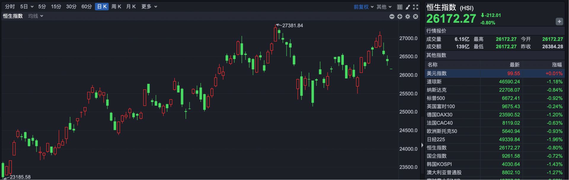 截至发稿,恒生指数报26172.27点,下跌212.01点,跌幅0.80%。