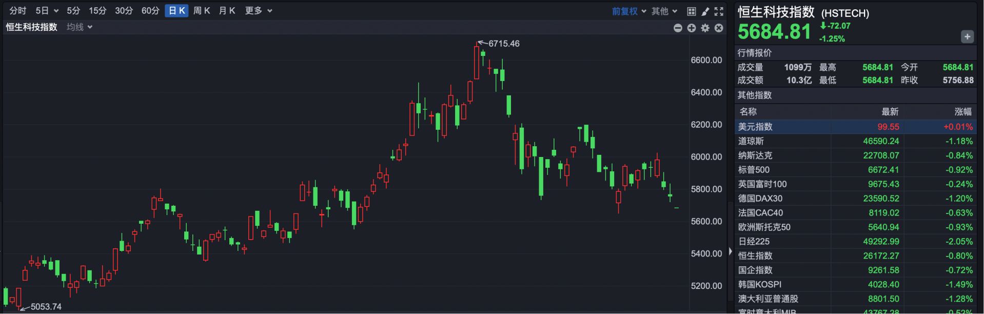 恒生科技指数报5684.81点,下跌72.07点,跌幅1.25%。