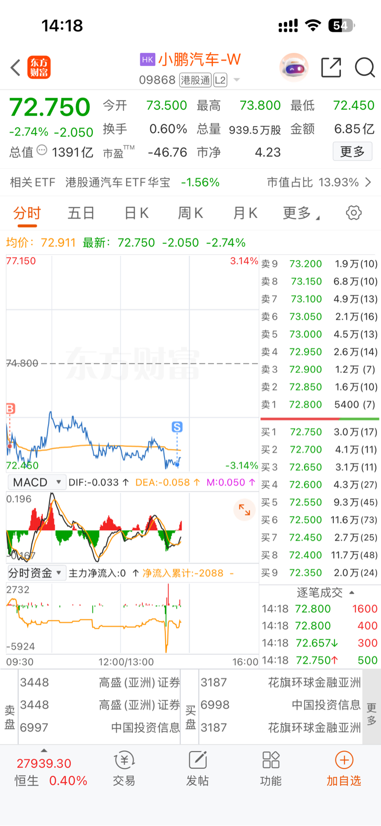 $小鹏汽车-W(HK|09868)$ 纠结了一天,成功卖在了最低点