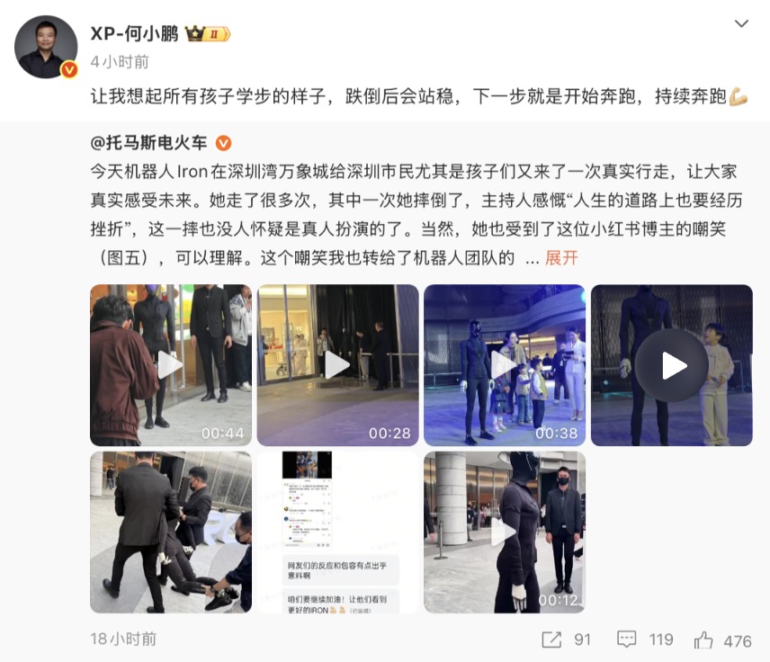 1月31日,小鹏机器人IRON在深圳万象城展出,现场为到场市民演绎“真实行走”。在多次行走中,有一次摔倒。2月1日,小鹏汽车董事长CEO何小鹏正面回应此事,他表示,“让我想起所有孩子学步的样子,跌倒后会站稳”“下一步就是开始奔跑,持续奔跑。”