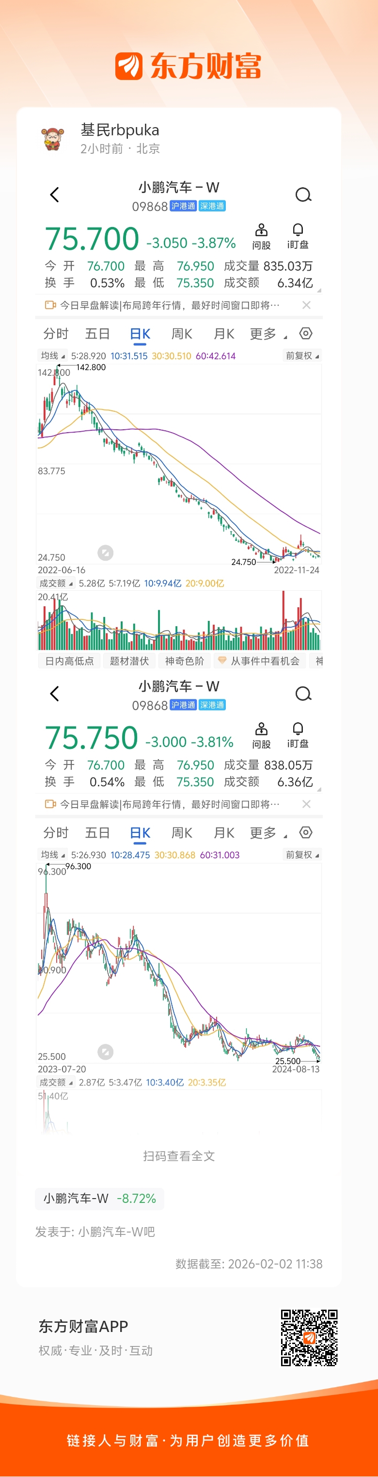$小鹏汽车-W(HK|09868)$ 发现这吧里人才济济啊,12月交付量不及预期,说是25年目标达成了,藏订单给26年冲量。结果一开年拉了坨大的,又说交付量不等于销量,看二月份,给我看的一乐一乐的捂脸看看历史走势吧,25抄底兄弟们!