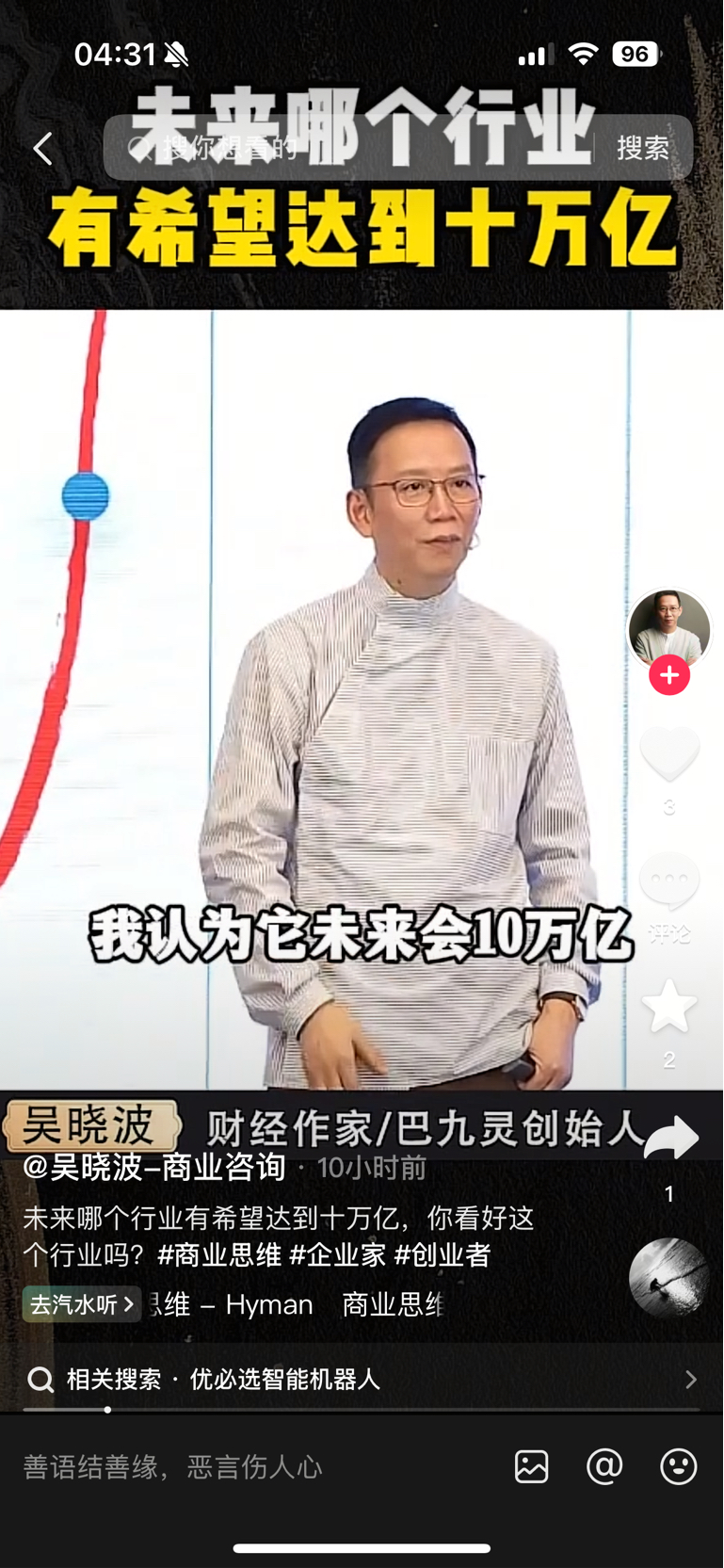 • 优必选10年后市值预判:吴晓波表示,中国具身智能机器人行业10年后市场规模将达到10万亿,目前优必选在港股市值约400多亿人民币,他认为优必选未来市值会达到10万亿。