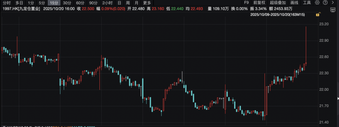 10月20日,香港地产股尾盘涨幅扩大。其中,九龙仓置业上涨4.46%,希慎兴业上涨3.27%,太古地产上涨2.33%,新世界发展上涨1.77%。