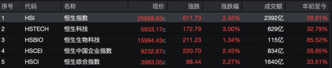 10月20日,港股三大指数强势上涨。截至收盘,恒生指数报25858.83点,上涨2.42%;恒生国企指数报9232.67点,上涨2.45%;恒生科技指数报5933.17点,上涨3%。全日大市成交额约为2392亿港元,南向资金净卖出26.70亿港元。