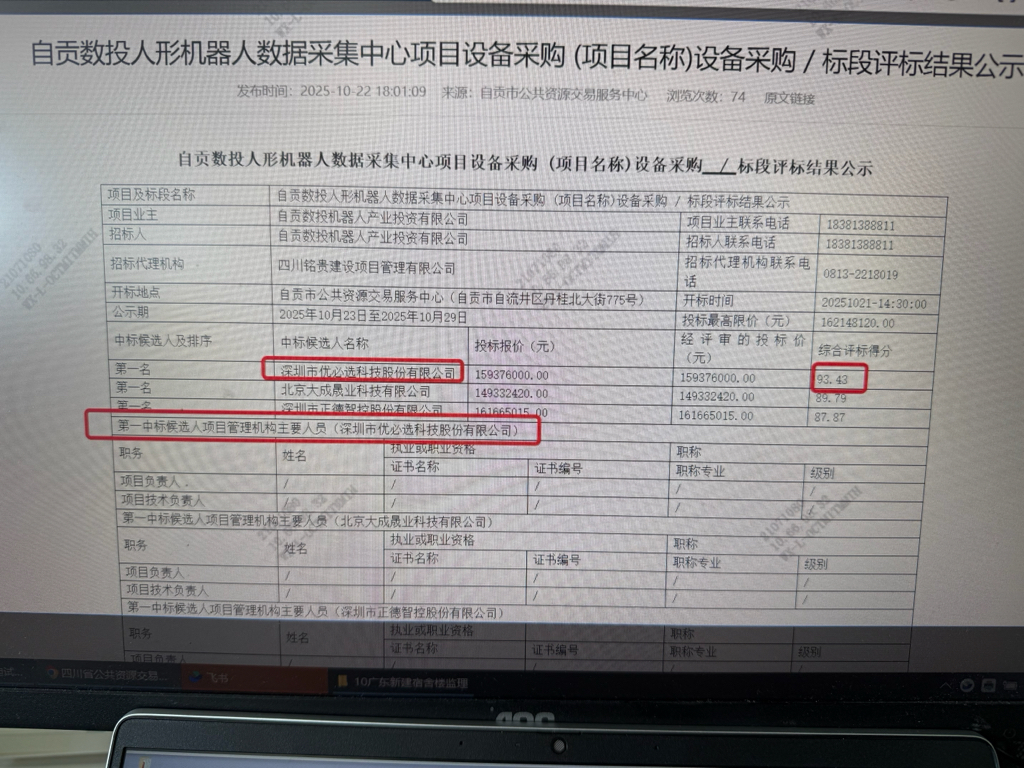 $优必选(HK|09880)$ 第一中标候选人,金额 1.59 亿元