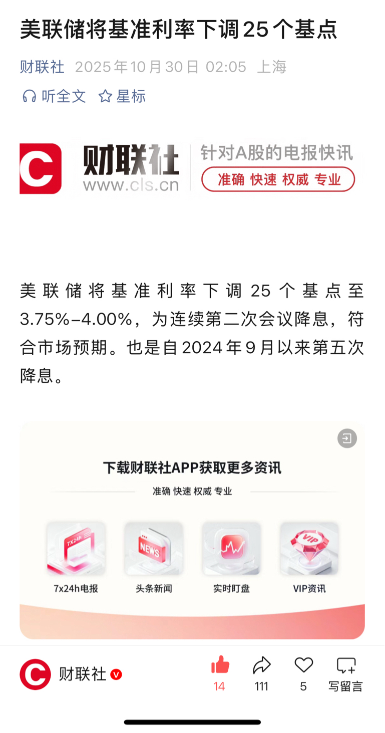 美联储将基准利率下调25个基点