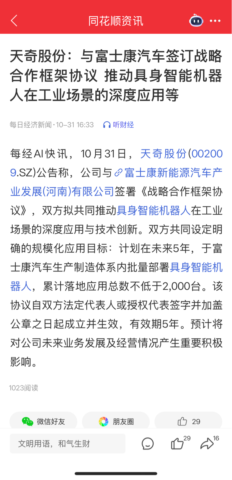 $优必选(HK|09880)$ 优必选和富士康有独家合作协议,天奇是优必选系统集成商,合作大概率是采购优必选机器人,预估金额10亿往上了