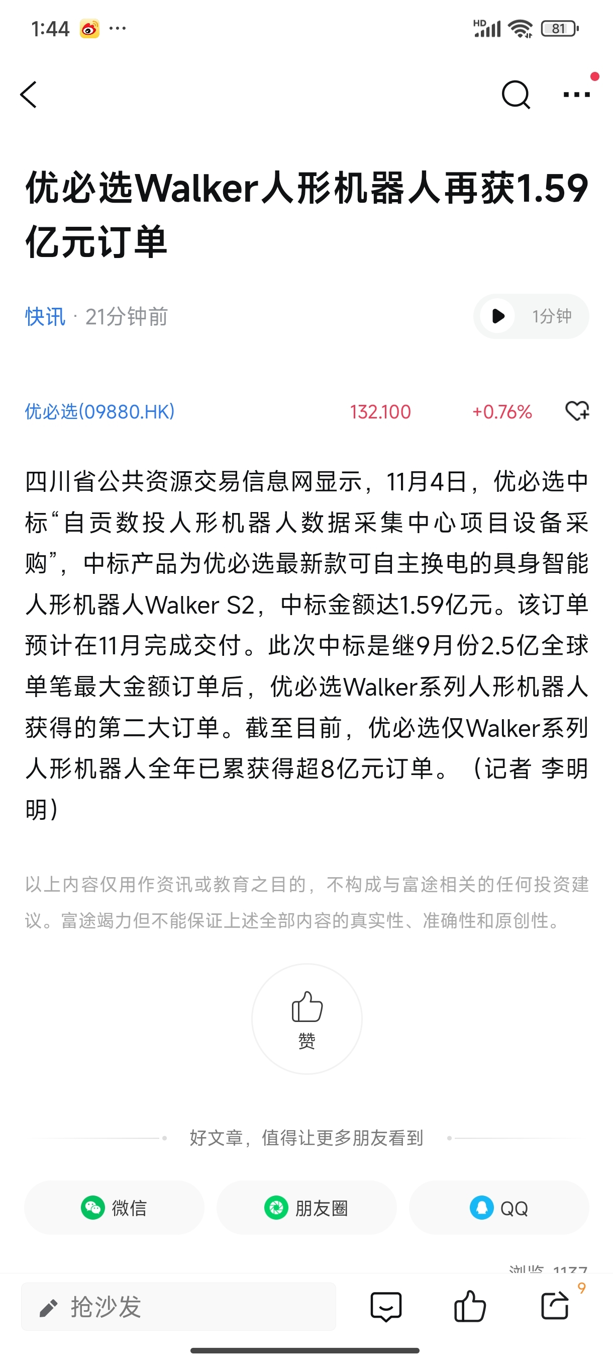 $优必选(HK|09880)$ 11月4日刚中1.59亿自贡人形机器人项目,这是9月2.5亿全球最大单后的第二大单!全年累计订单直接冲破8亿,商业化落地速度妥妥领跑。