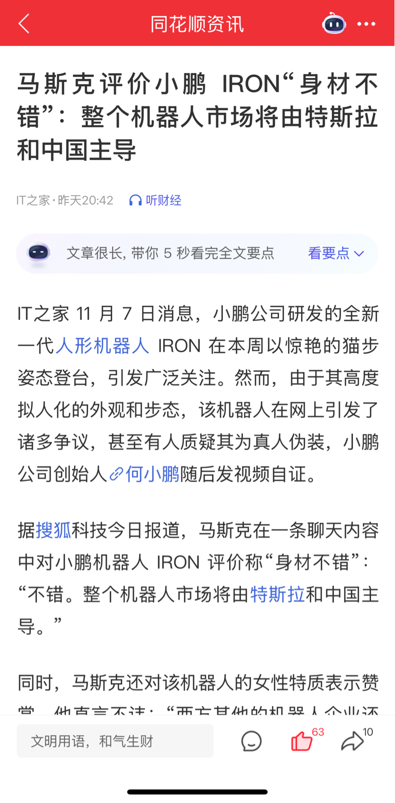 据搜狐科技今日报道,马斯克在一条聊天内容中对小鹏机器人 IRON 评价称“身材不错”:“不错。整个机器人市场将由特斯拉和中国主导。”