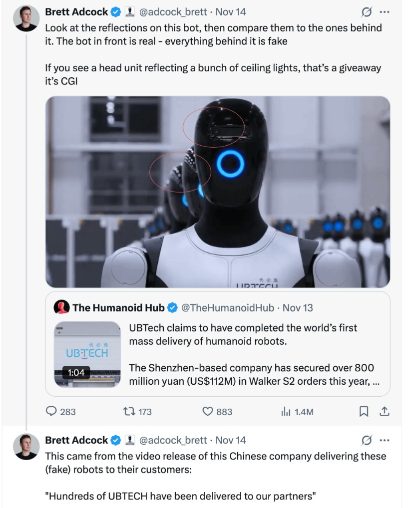 此前,优必选发布了工业人形机器人Walker S2量产交付视频。Figure创始人布雷特·爱德考克(Brett Adcock)在社交平台公开质疑视频中是“fake robots”,大概率是电脑特效制作。