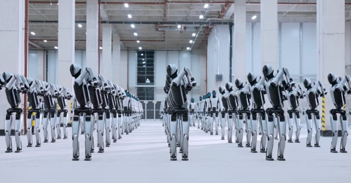 图为优必选机器人排队进工厂