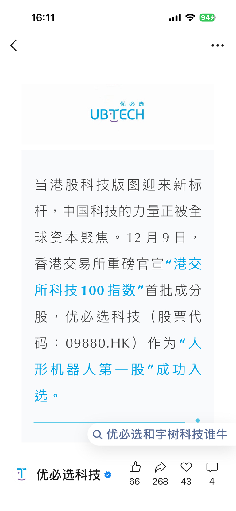 $优必选(HK|09880)$ 优必选被选入港交所科技100指数