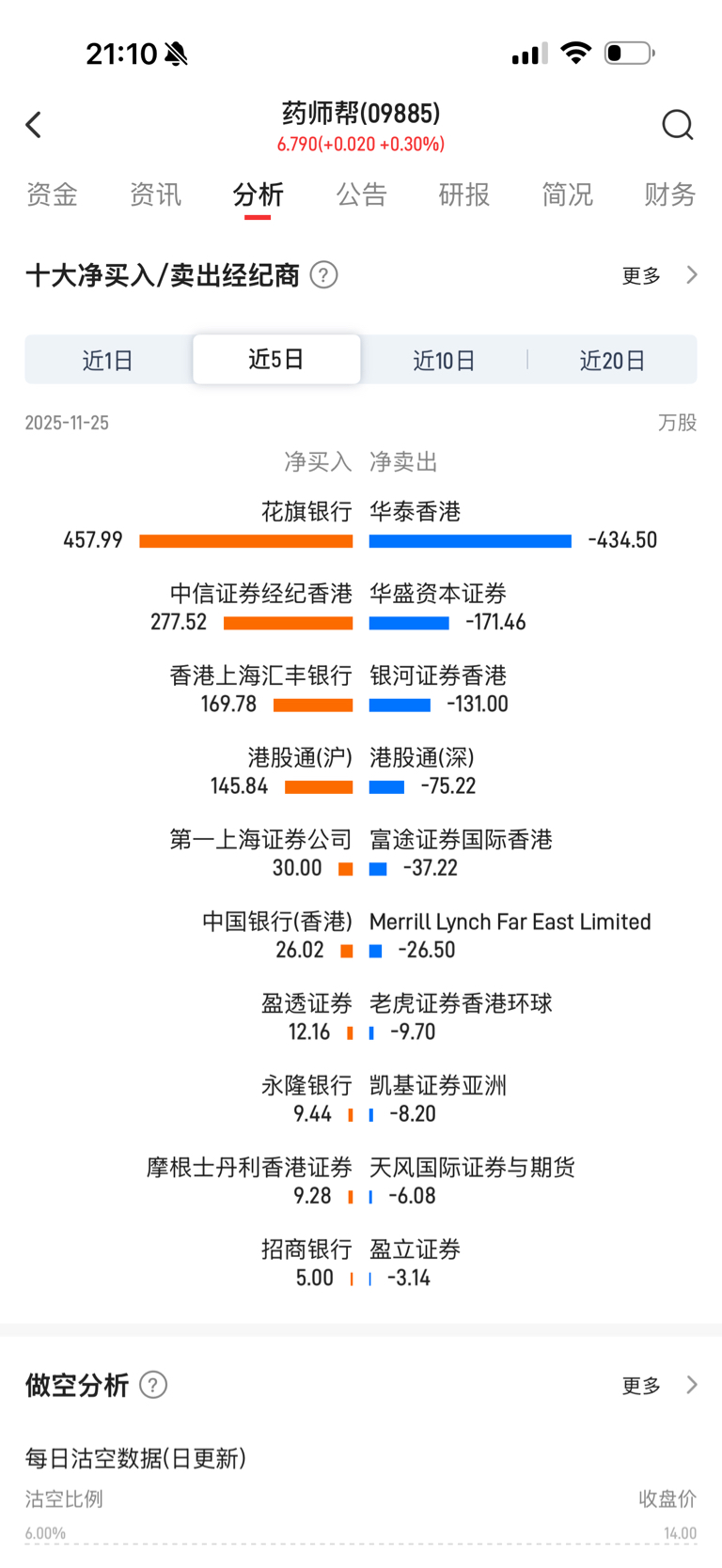 $药师帮(HK|09885)$ 花旗银行最近5日都在净买入