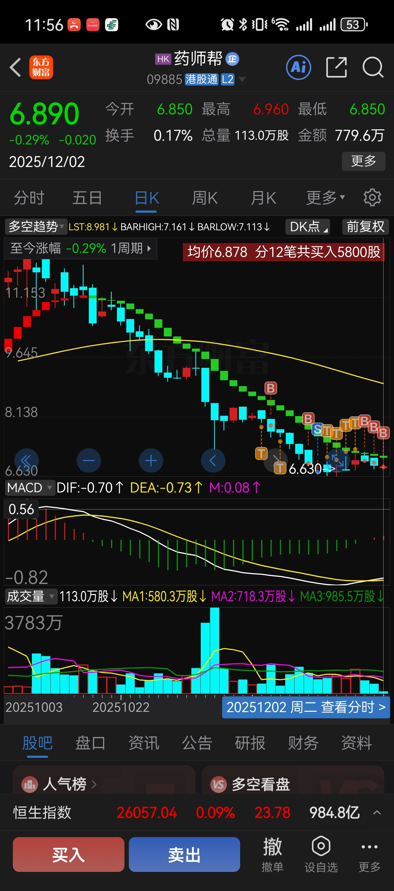 $药师帮(HK|09885)$ 只挂了两个单,竟然给我分12笔成交,而且还有部分没成