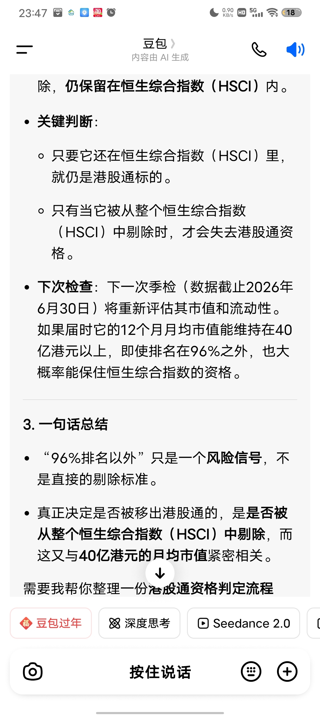 - 下次检查:下一次季检(数据截止2026年6月30日)将重新评估其市值和流动性。如果届时它的12个月月均市值能维持在40亿港元以上,即使排名在96%之外,也大概率能保住恒生综合指数的资格。