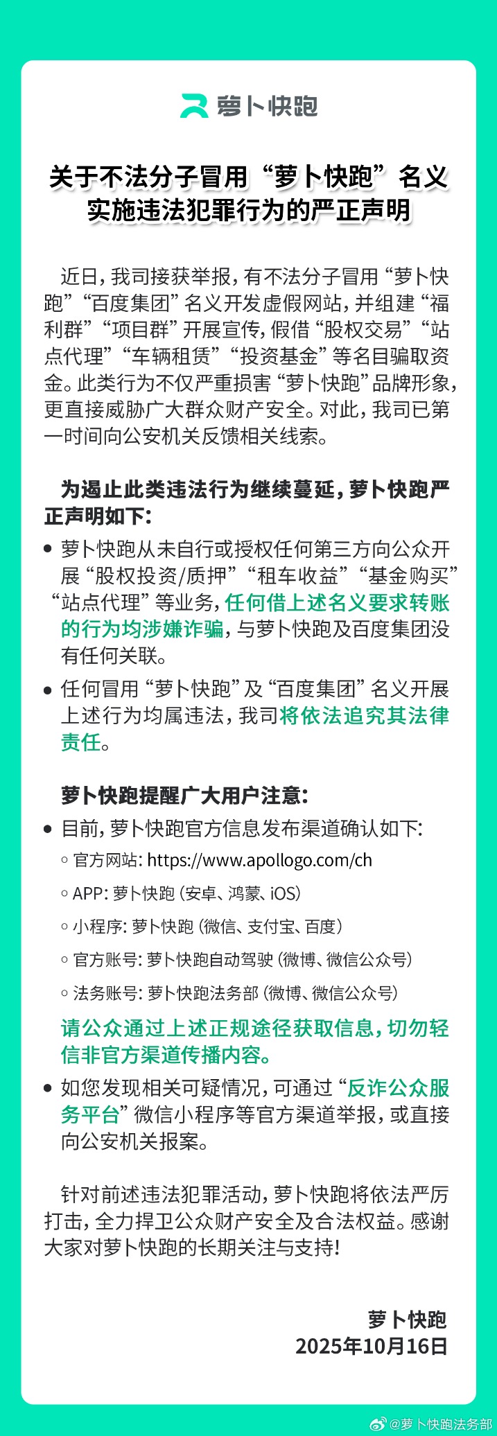 萝卜快跑:有不法分子冒名开发虚假网站 假借股权交易等名目骗取资金