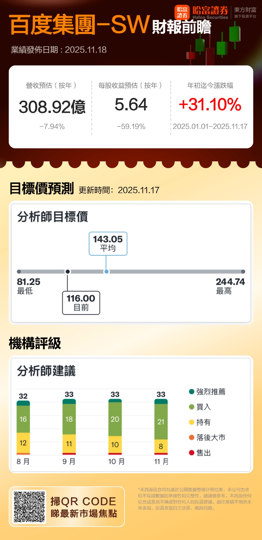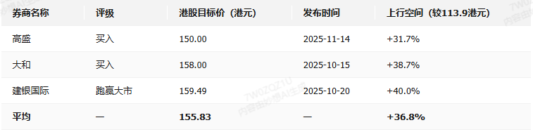 2025年10月至11月,主流券商对百度集团-SW的评级与目标价呈现高度乐观共识: