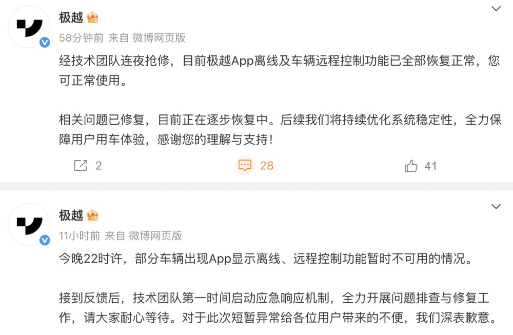 24日上午9时左右,极越汽车方面再次回应称,经技术团队连夜抢修,目前极越App离线及车辆远程控制功能已全部恢复正常,可正常使用。“相关问题已修复,后续我们将持续优化系统稳定性,全力保障用户用车体验。”