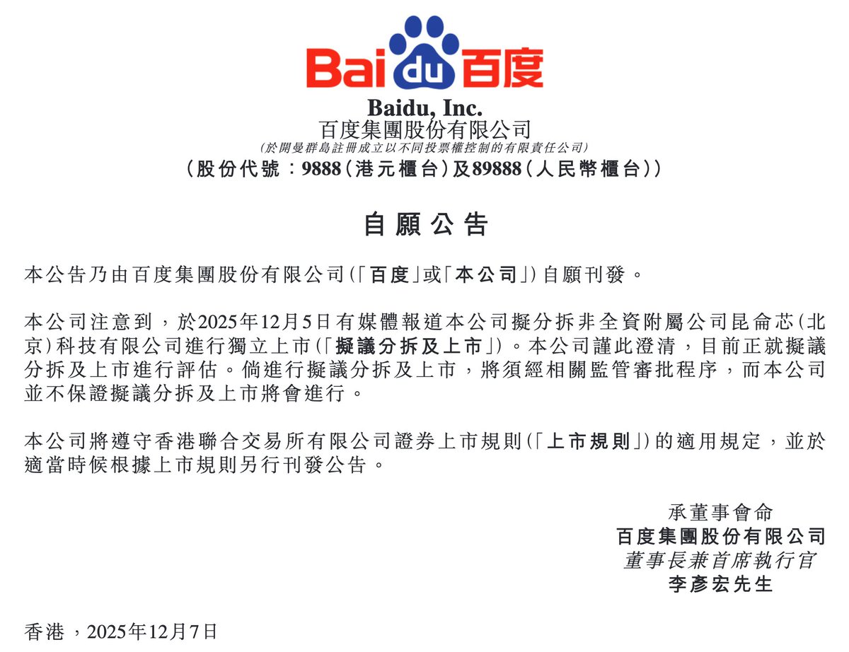 百度港交所公告:公司注意到,于2025年12月5日有媒体报道本公司拟分拆非全资附属公司昆仑芯(北京)
