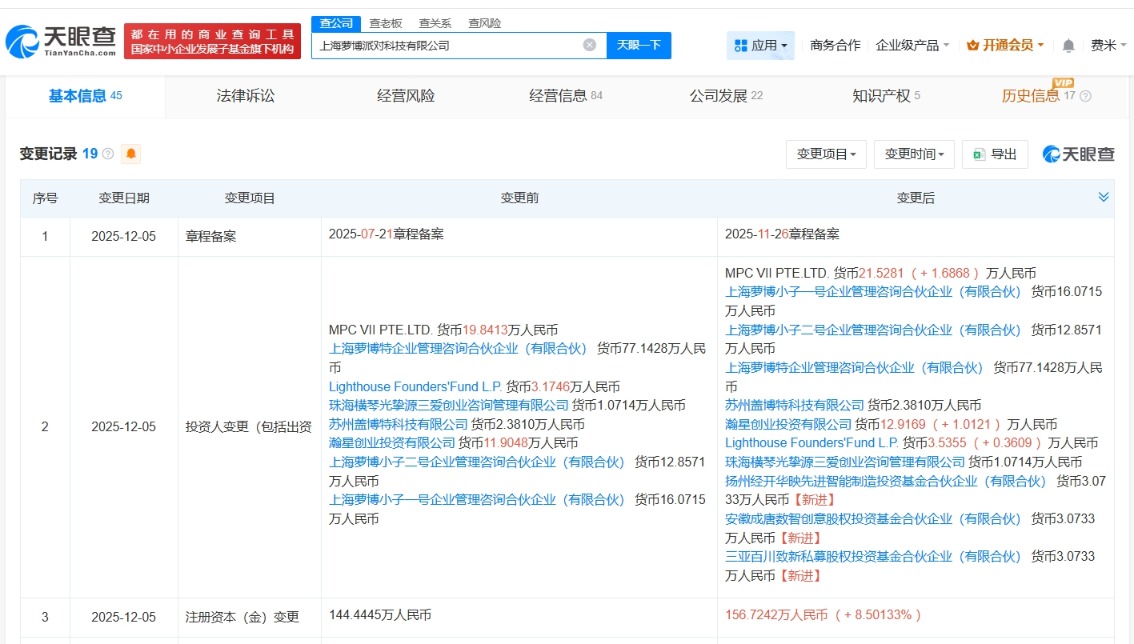 南方财经12月11日电,天眼查App显示,近日,上海萝博派对科技有限公司发生工商变更,新增百度旗下三亚百川致新私募股权投资基金合伙企业(有限合伙)、安徽成唐数智创意股权投资基金合伙企业(有限合伙)、扬州经开华映先进智能制造投资基金合伙企业(有限合伙)为股东,同时,注册资本由约144.4万人民币增至约156.7万人民币。该公司成立于今年2月,法定代表人为黄一,经营范围包括智能机器人的研发、智能机器人销售、工业机器人制造等,现由上海萝博特企业管理咨询合伙企业(有限合伙)、MPCVIIPTE.LTD.及上述新增股东等共同持股。官网显示,萝博派对是一家专注于人形机器人的前沿科技公司。