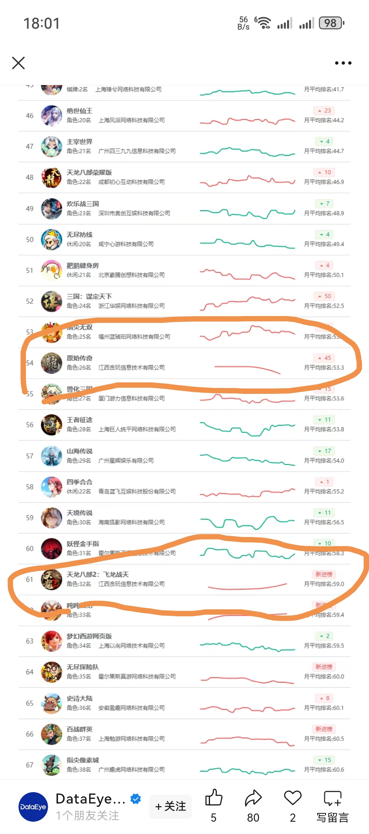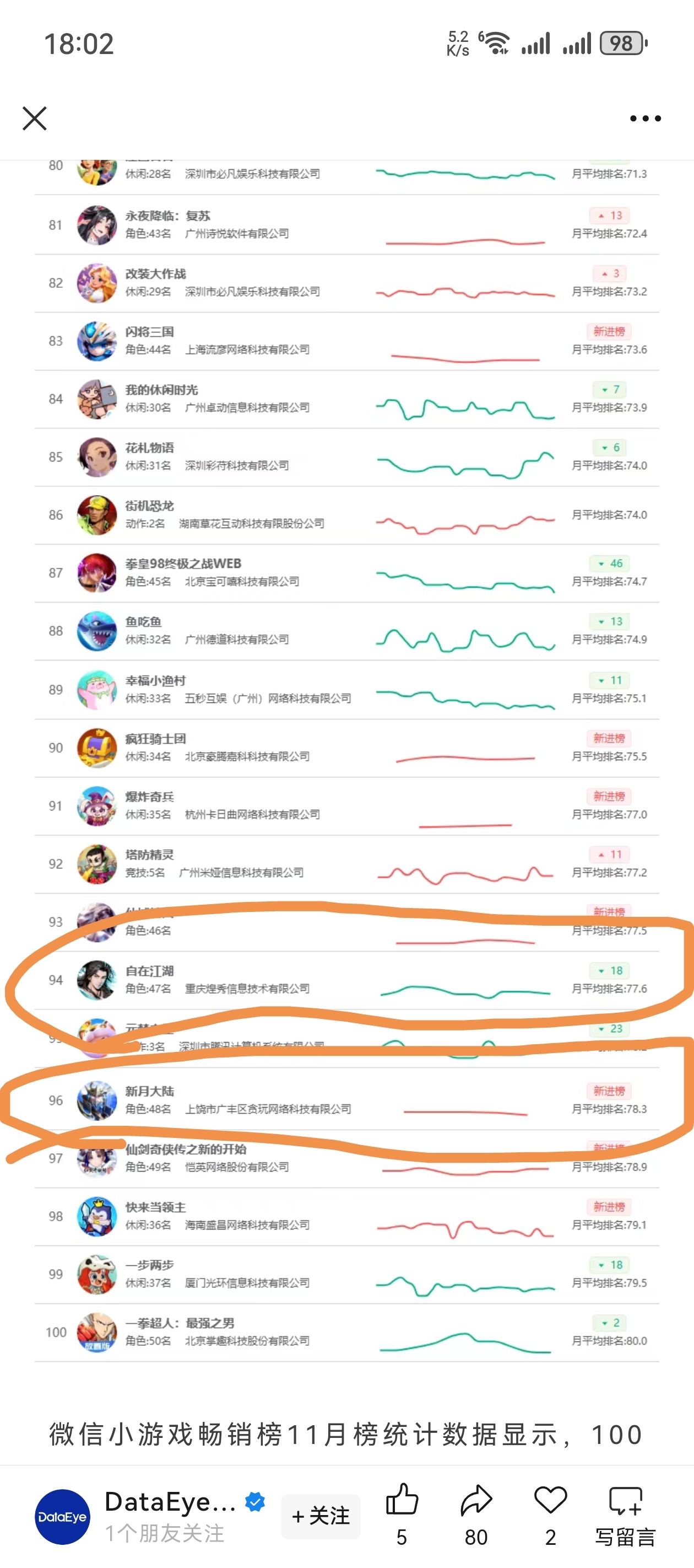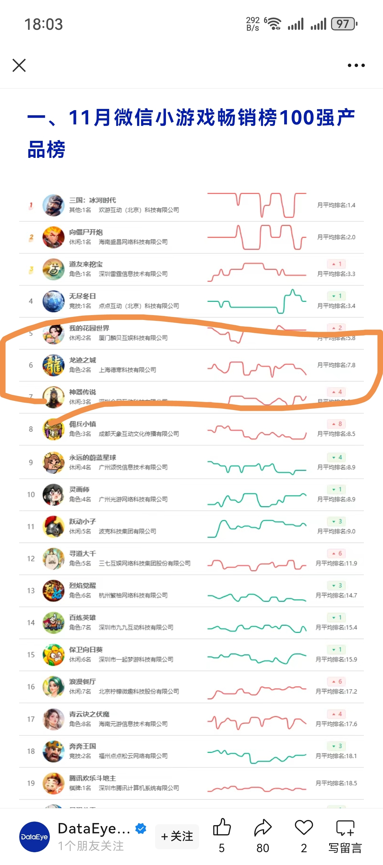 11月小程序畅销榜榜单里前100进了5个龙迹之城-月均7.8原始传奇-月均53天