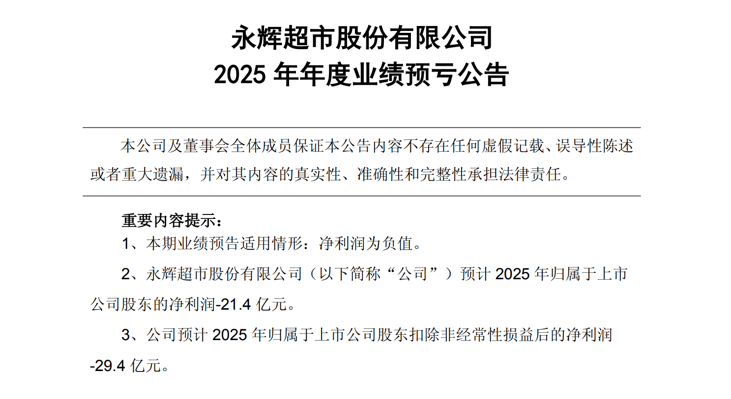 永辉超市日前发布的业绩预告显示,公司预计2025年归属于上市公司股东的净利润-21.4亿元;扣非后,亏损将进一步扩大至29.4亿元。