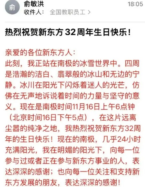 “老板在南极,员工在加班。”这是不少网友在看到俞敏洪的最新全员信后的第一反应。