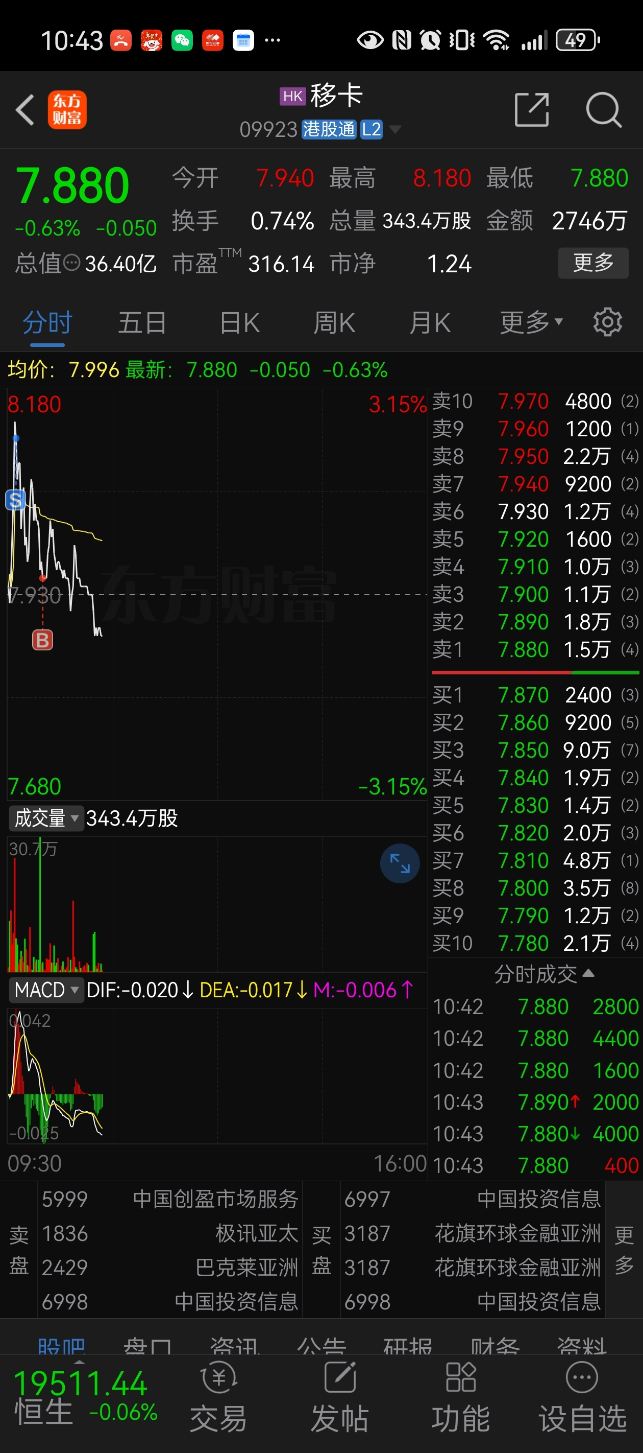 $移卡(HK|09923)$ 又接早了~因为看好它,生怕它飞,不过接下来我依然会在适当价位卖出,因为空头还没死