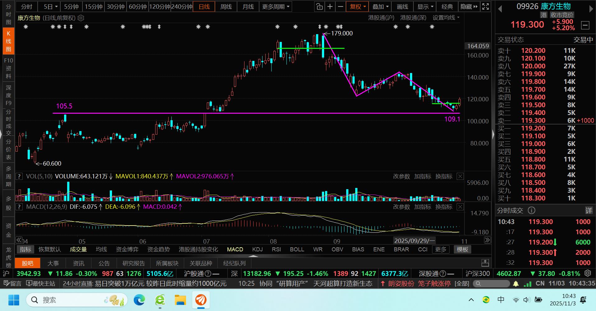 11月3日,康方生物,走出底分型,结构完美,调整到位了。