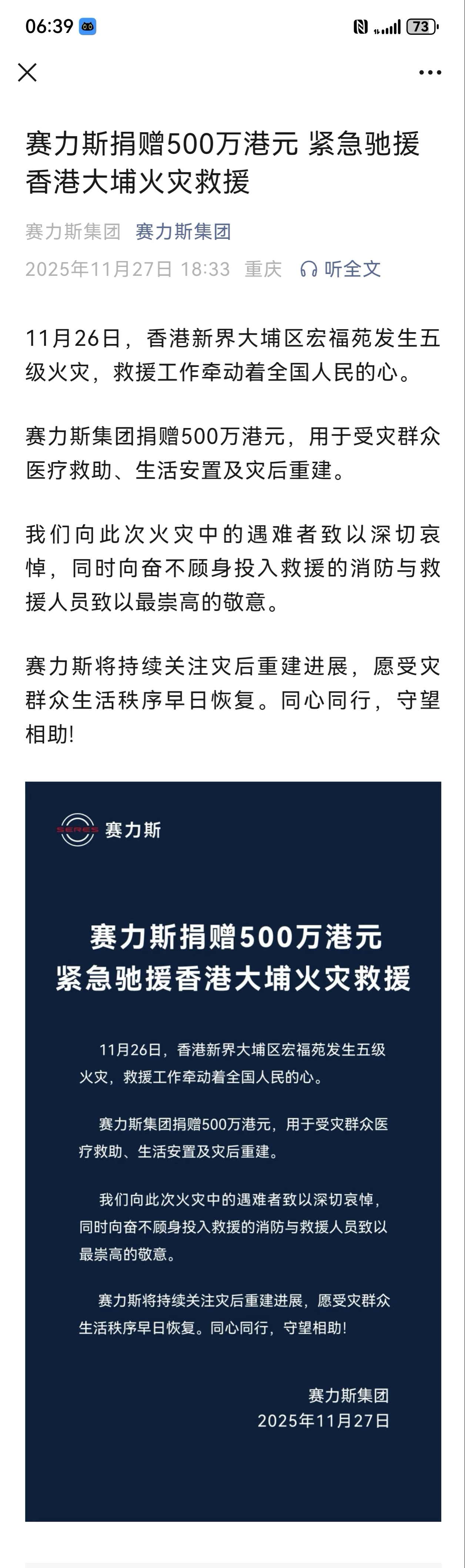 赛力斯捐赠500万港元 紧急驰援香港大埔火灾救援
