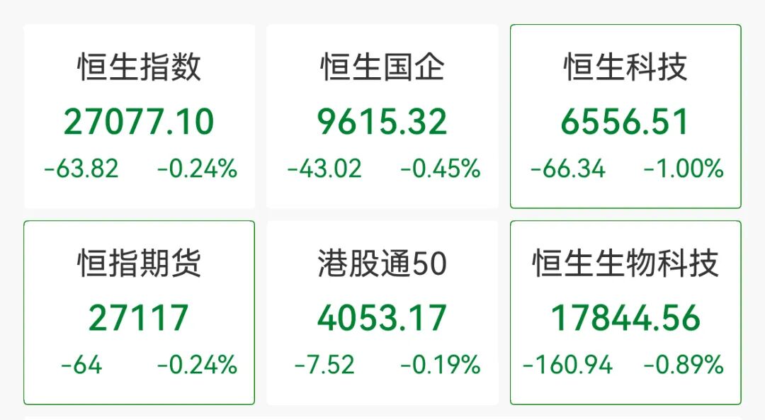 截至发稿,恒生指数跌0.24%,恒生科技指数跌1%。